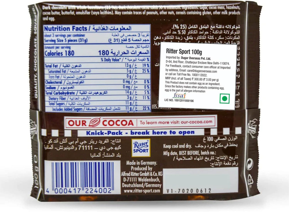 شوكولاتة ريتر الداكنة بحبات البندق الكاملة - 8 × 10 × 100 جرام